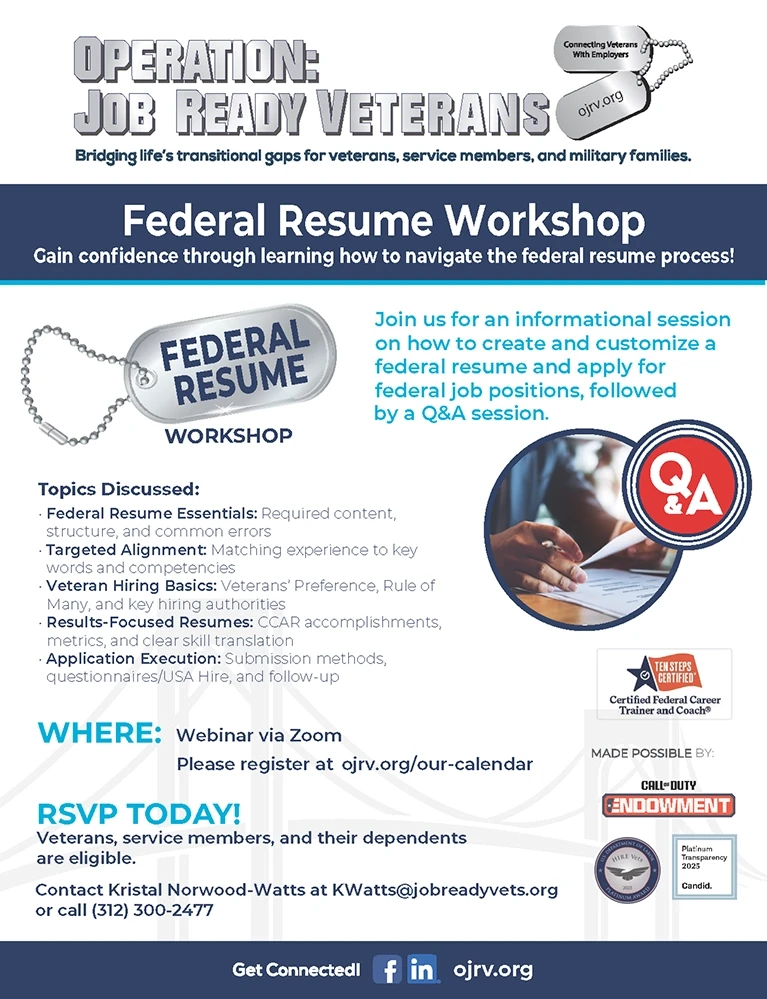 Federal Resume – Virtual VETS Workshop + Add to Google Calendar + iCal / Outlook export Book Event Select Date * 2026-04-29 12:00 pm - 2026-04-29 1:00 pm 2026-05-27 12:00 pm - 2026-05-27 1:00 pm 2026-06-24 12:00 pm - 2026-06-24 1:00 pm 2026-07-22 12:00 pm - 2026-07-22 1:00 pm 2026-08-19 12:00 pm - 2026-08-19 1:00 pm 2026-09-16 12:00 pm - 2026-09-16 1:00 pm Federal Resume - Virtual VETS Workshop Free Available Tickets: 100 The "Federal Resume - Virtual VETS Workshop" ticket is sold out. You can try another ticket or another date. Next Date Apr 29 2026 Time (EST) 12:00 pm - 1:00 pm REGISTER Share this event SearchSearch