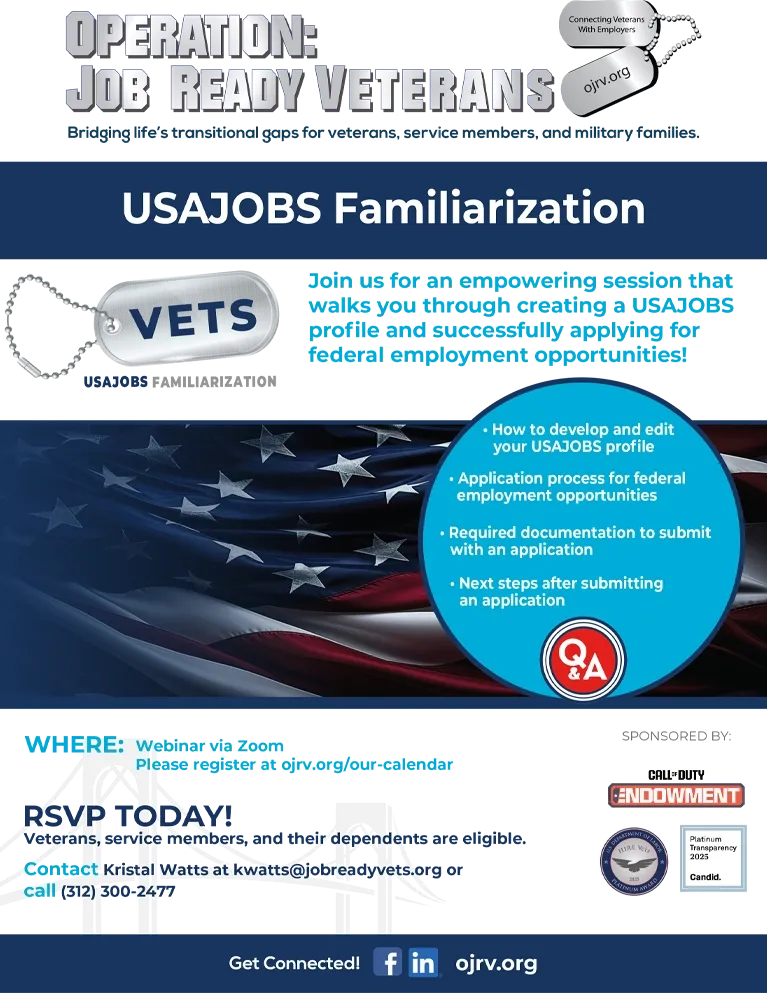 USAJOBS Familiarization + Add to Google Calendar + iCal / Outlook export Book Event USAJOBS Familiarization Free Available Tickets: 100 The "USAJOBS Familiarization" ticket is sold out. You can try another ticket or another date. Next Date Apr 15 2026 Time (EST) 12:00 pm - 1:00 pm REGISTER Share this event SearchSearch